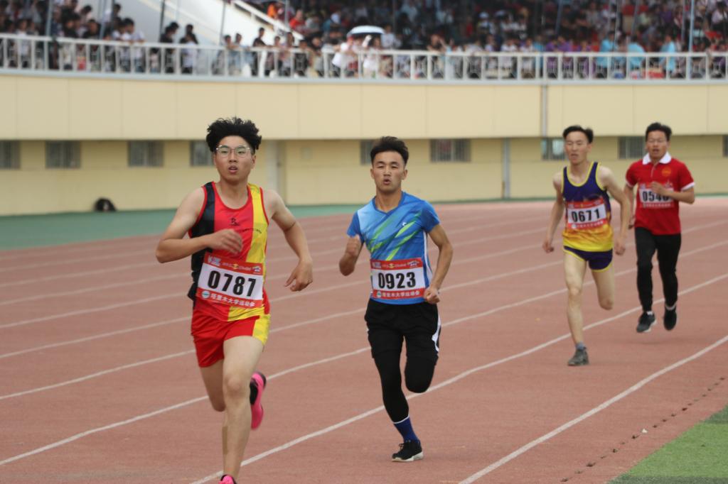 百米比賽中,個個都在突破著自己的極限,個個都在與時間賽跑。水建院鄧陽在100米小組賽中奮力拼搏,奪得第一名的好成績。