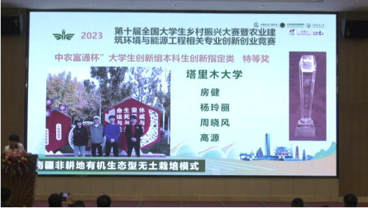 4月2日,第十屆“中農富通杯”大學生鄉村振興創新創業大賽暨農業建筑環境與能源工程相關專業雙創大賽在福州市落下帷幕。我校譚占明老師指導的參賽作品《南疆非耕地有機生態型無土栽培模式》從來自42所大學的98支參賽隊伍中脫穎而出,榮獲特等獎,是新疆賽區唯一一支榮獲國家特等獎的隊伍。同時,馬全會、閆芬芬、周文婷老師指導的隊伍均獲得三等獎,塔里木大學獲得優秀組織單位。