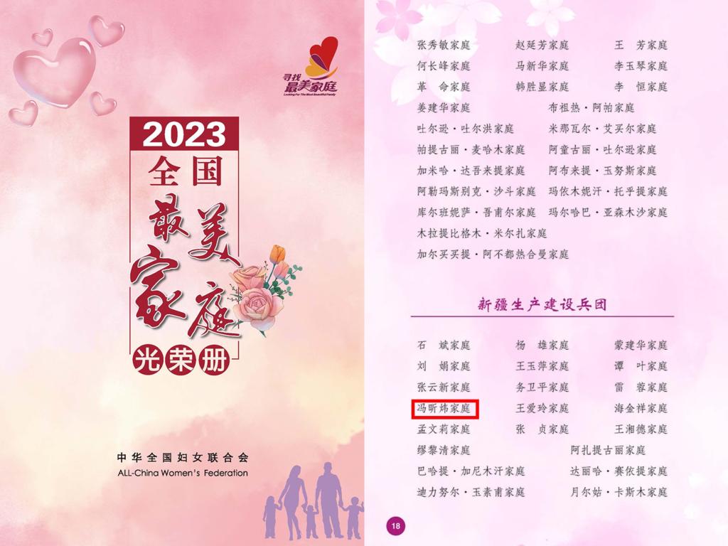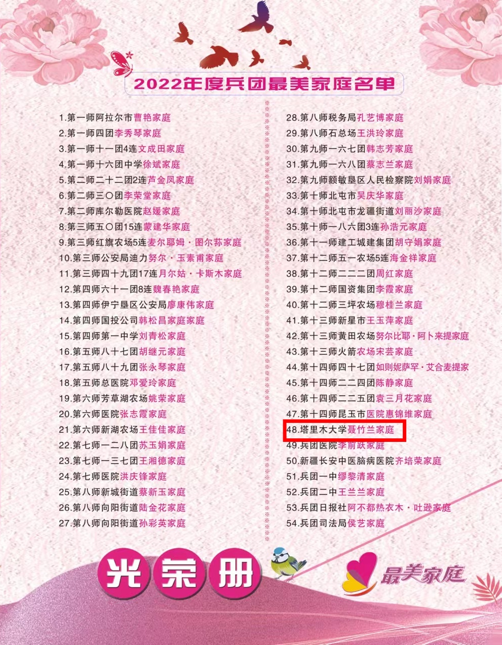 5.15國(guó)際家庭日前夕,全國(guó)婦聯(lián)揭曉1000戶全國(guó)最美家庭,我校馮昕煒、許貴善家庭榮獲2023年全國(guó)最美家庭。兵團(tuán)婦聯(lián)揭曉54戶兵團(tuán)最美家庭,我校聶竹蘭、魏杰家庭獲2022年兵團(tuán)最美家庭。