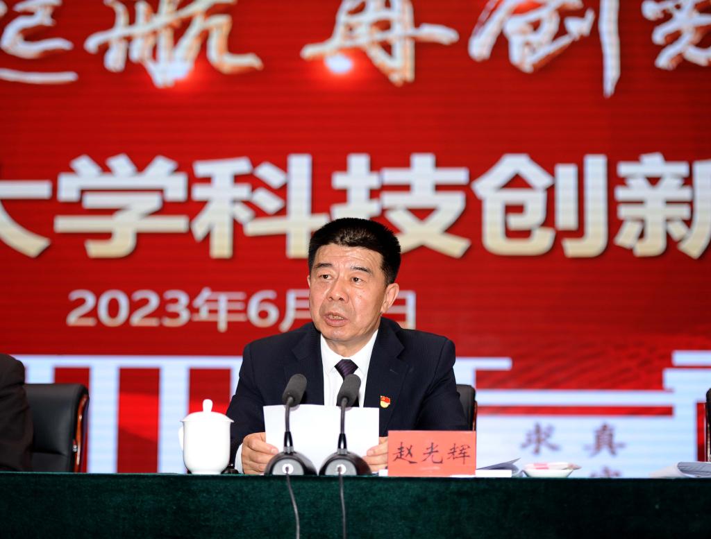 趙光輝代表學校黨委向出席大會的各位領導和專家表示熱烈的歡迎,向兵團科技局長期以來對學校科技事業發展的關心和支持表示誠摯的感謝和敬意,對表彰的優秀科技工作者表示熱烈的祝賀,向全校廣大科技工作者致以誠摯的問候,對強化有組織科研、實現高質量發展、提供高質量服務提出四點意見:一是要提高政治站位,深刻認識做好科技創新工作的重大意義;二是要堅定發展信心,全面總結五年來科技創新社會服務工作;三是要堅持問題導向目標導向,深刻把握科技創新工作的戰略機遇和戰略任務;四是要堅持突出工作重點,推動高質量科研創新。