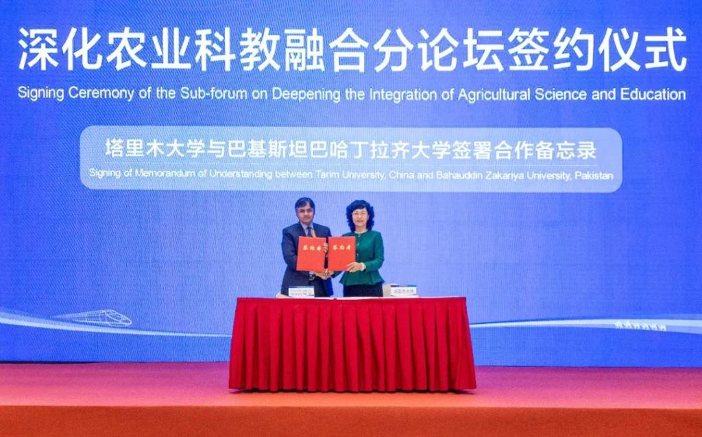張愛萍代表塔里木大學與巴基斯坦巴哈丁拉齊大學研究、創新和商業辦公室主任穆罕默德·納賈姆·哈克簽署兩校合作備忘錄。