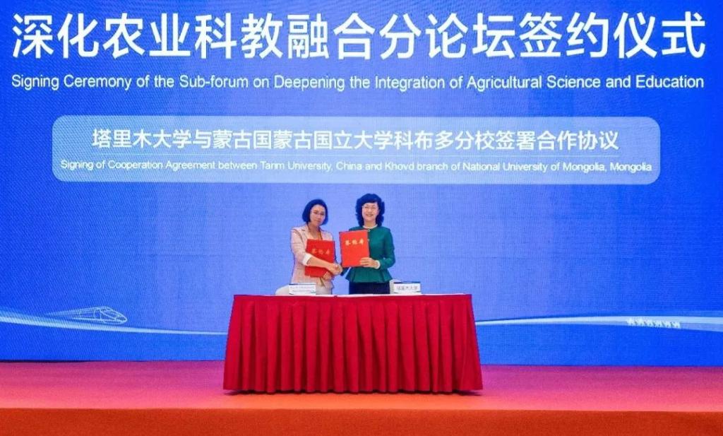 張愛萍代表塔里木大學與蒙古國蒙古國立大學科布多分校副校長阿穆爾扎雅簽署兩校合作協議。