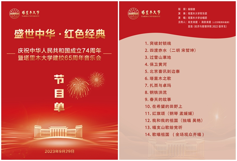 六十五載篳路藍(lán)縷,六十五年風(fēng)華正茂。在中華人民共和國(guó)成立74周年、塔里木大學(xué)建校65周年之際,9月29日晚,塔里木大學(xué)“盛世中華 紅色經(jīng)典”慶祝中華人民共和國(guó)成立74周年暨塔里木大學(xué)建校65周年音樂(lè)會(huì)在新體育館火熱上演。