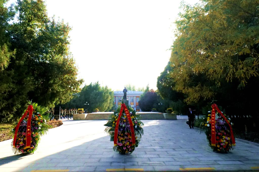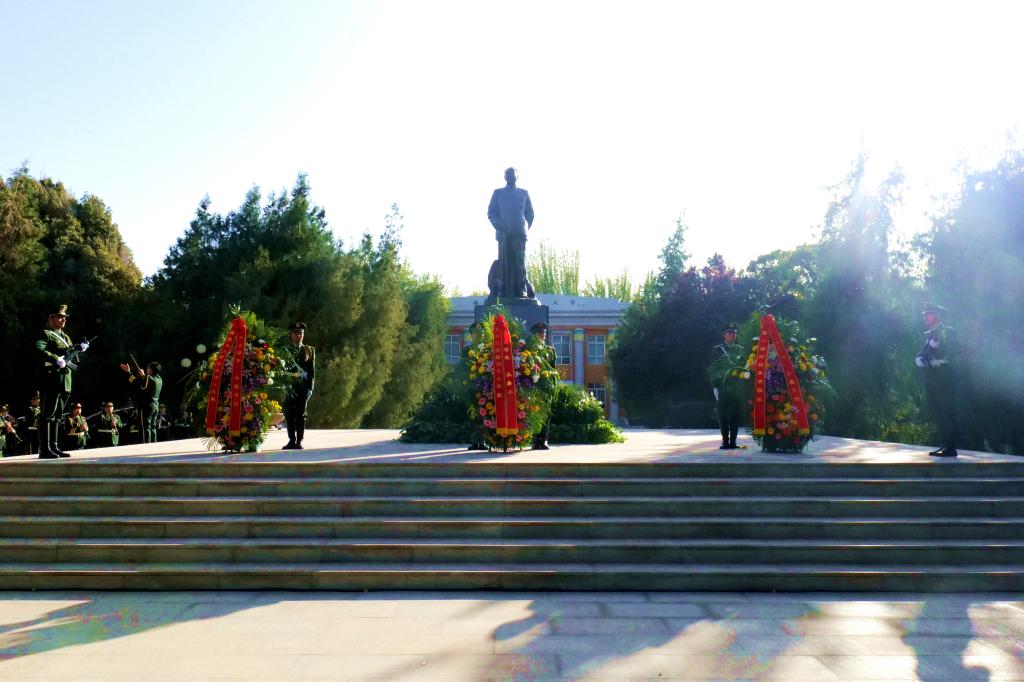 英雄不朽,精神永存。在秋天朝露的映襯下,紅色文化廣場中央,王震將軍銅像巍然聳立,廣場兩旁松柏傲然挺立。銅像基座上白菊等鮮花,寄托著全體塔大兒女對英烈的深情追思。