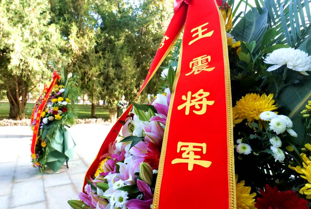 方陣前,以三五九旅將帥子女、兵團第一師阿拉爾市、塔里木大學敬獻的3個花籃一字排開,花籃紅色緞帶上書寫的“王震將軍 永垂不朽”格外醒目。王震將軍名字和生平鐫刻在銅像上,記錄著將軍一生的威嚴與雄壯。