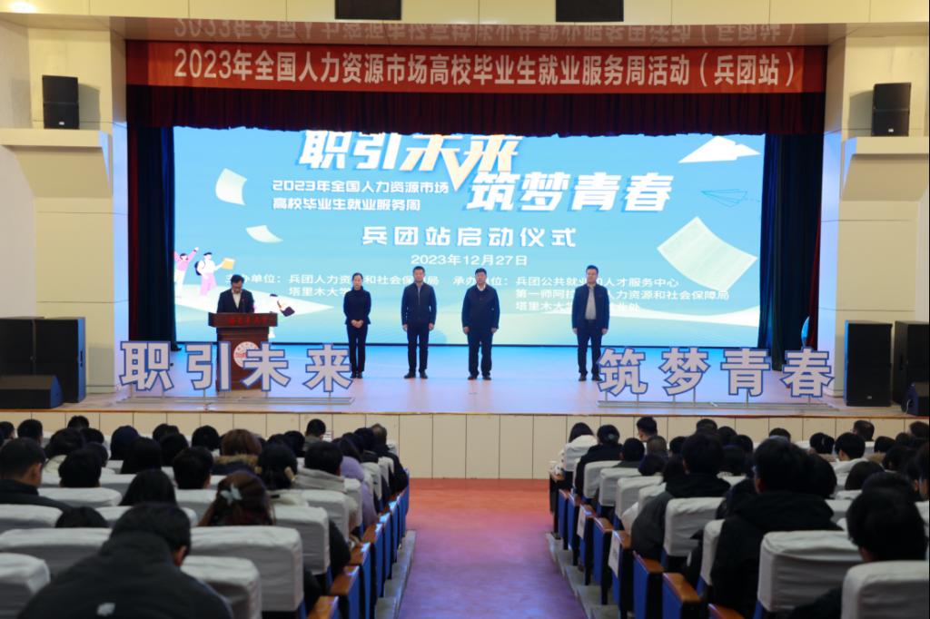 12月27日上午,2023年全國(guó)人力資源市場(chǎng)高校畢業(yè)生就業(yè)服務(wù)周(兵團(tuán)站)啟動(dòng)儀式在我校舉行。黨委常委、副校長(zhǎng)林松濤,兵團(tuán)人力資源和社會(huì)保障局黨組成員、副局長(zhǎng)蔡子童出席。啟動(dòng)儀式以“職引未來(lái) 筑夢(mèng)青春”為主題,由招生就業(yè)處副處長(zhǎng)孔黎主持,在大學(xué)生活動(dòng)中心報(bào)告廳舉行。