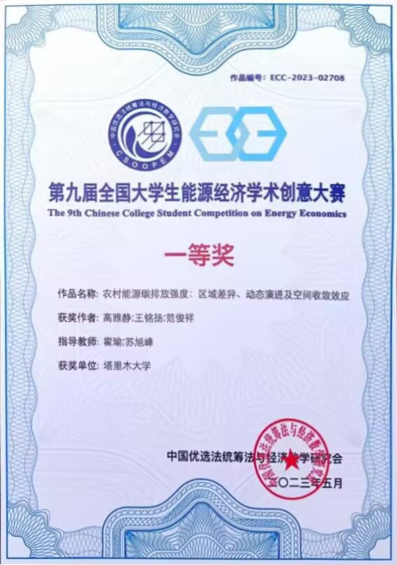 2023年5月,我校代表隊獲全國大學生能源經濟學術創(chuàng)意大賽一等獎。