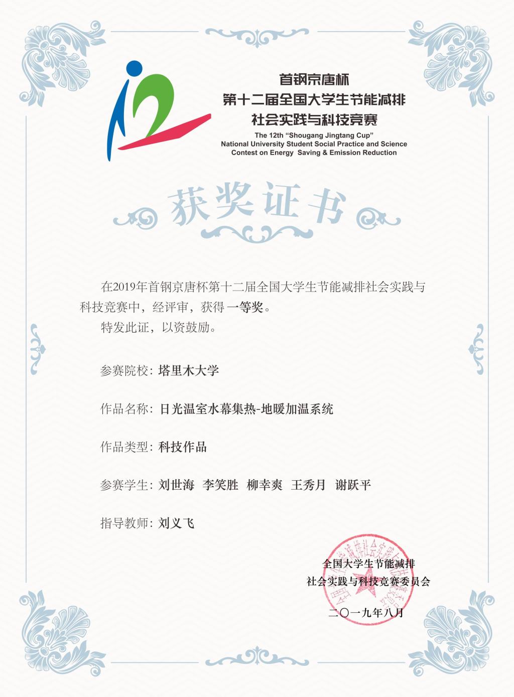 2019年8月,我校代表隊獲全國大學生節(jié)能減排社會實踐與科技競賽一等獎。