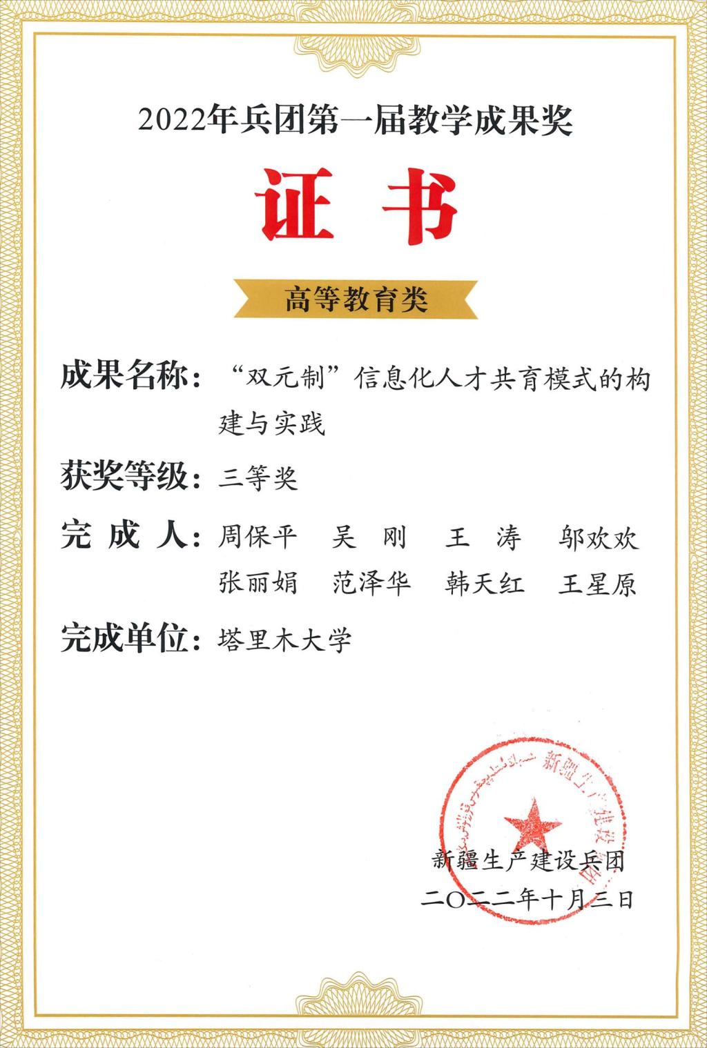 2022年10月,周保平等獲兵團教學成果獎三等獎。