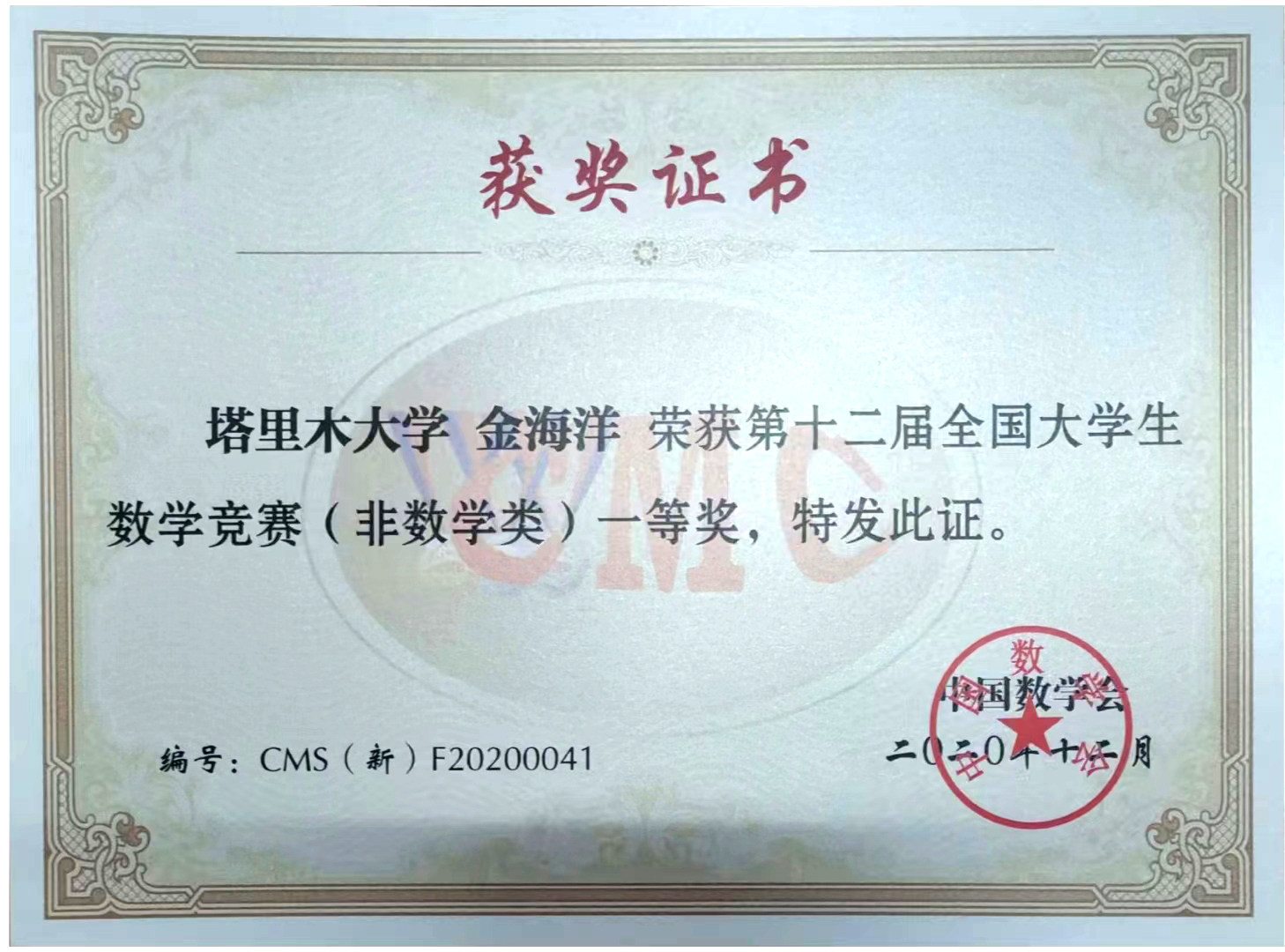 2020年12月,我校學生獲全國大學生數(shù)學競賽(非教學類)一等獎。