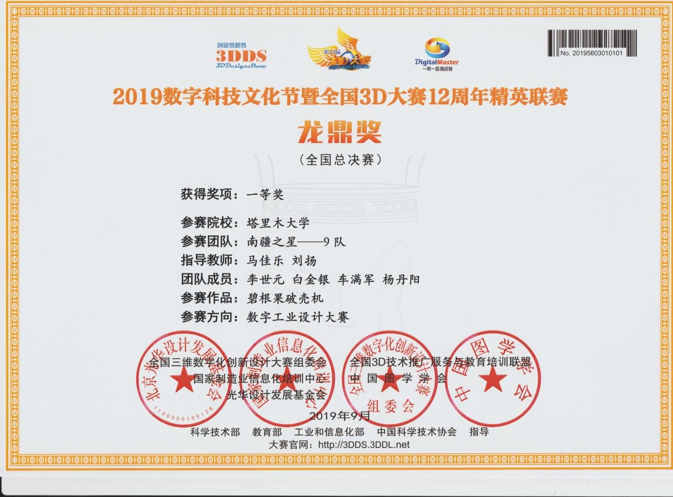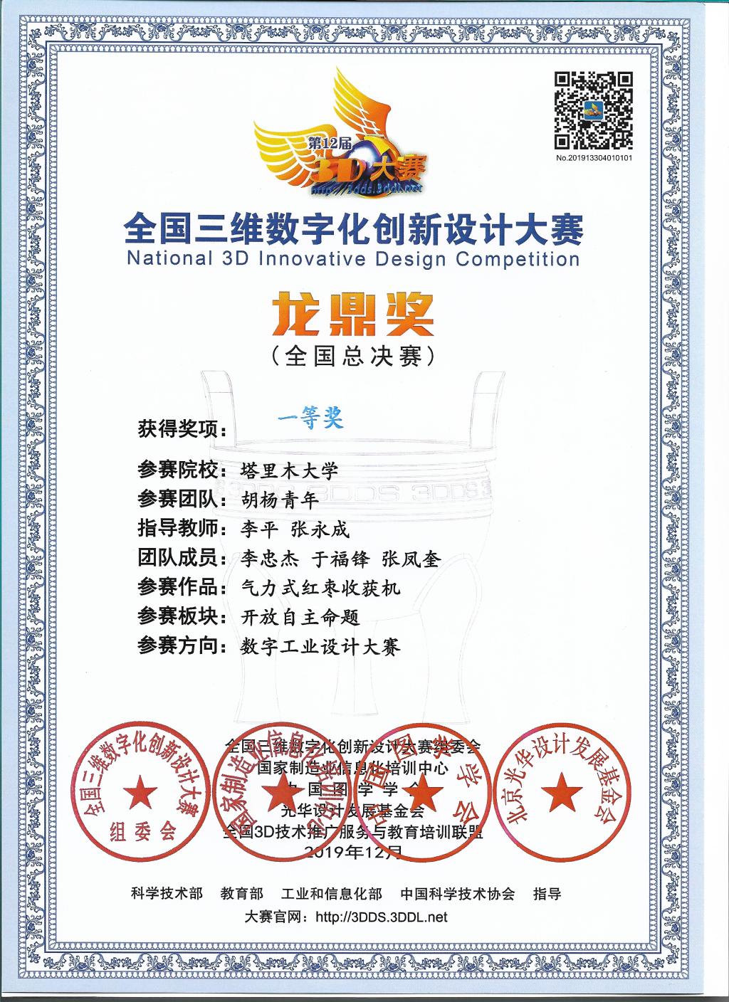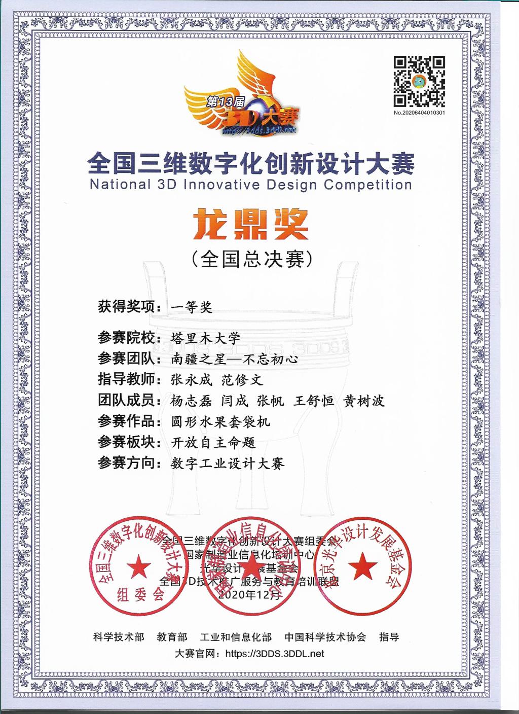 2019年12月,我校代表隊獲全國三維數(shù)字化創(chuàng)新設計大賽龍鼎獎一等獎。