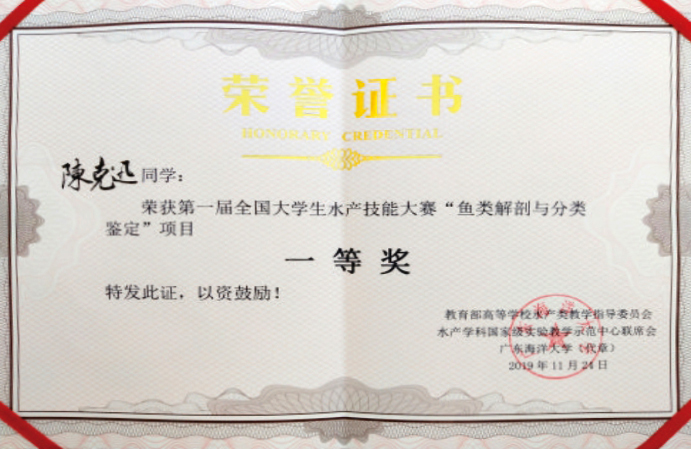 2019年11月,我校學生獲全國大學生水產技能大賽“魚類解剖與分類鑒定”項目一等獎。