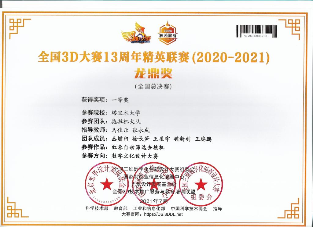 2020年12月,我校代表隊獲全國三維數(shù)字化創(chuàng)新設計大賽龍鼎獎一等獎。