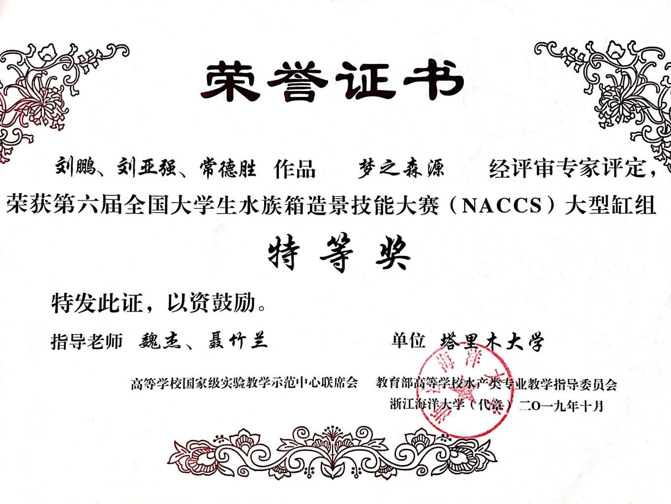 2019年10月,我校代表隊獲全國大學生水族箱造景技能大賽(NACCS)大型缸組特等獎。