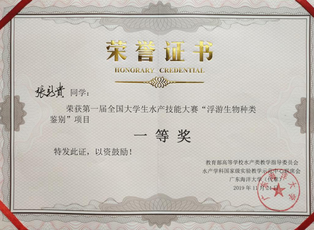 2019年11月,我校學生獲全國大學生水產技能大賽“浮游生物種類鑒別”項目一等獎。