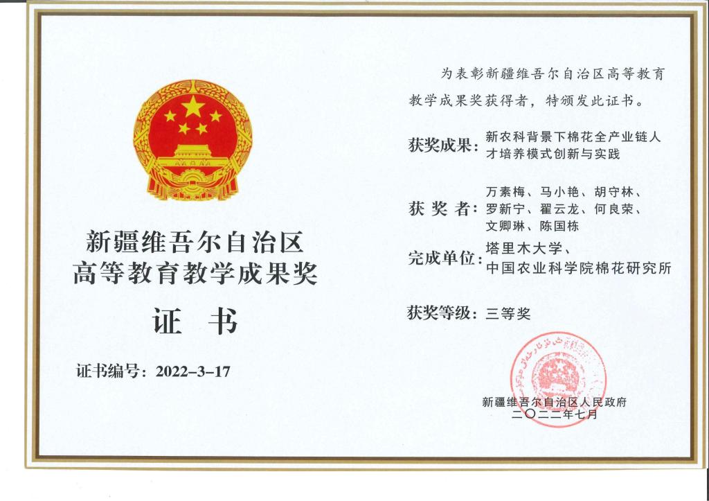 2022年7月,張傳輝等獲自治區(qū)高等教育教學成果獎三等獎。