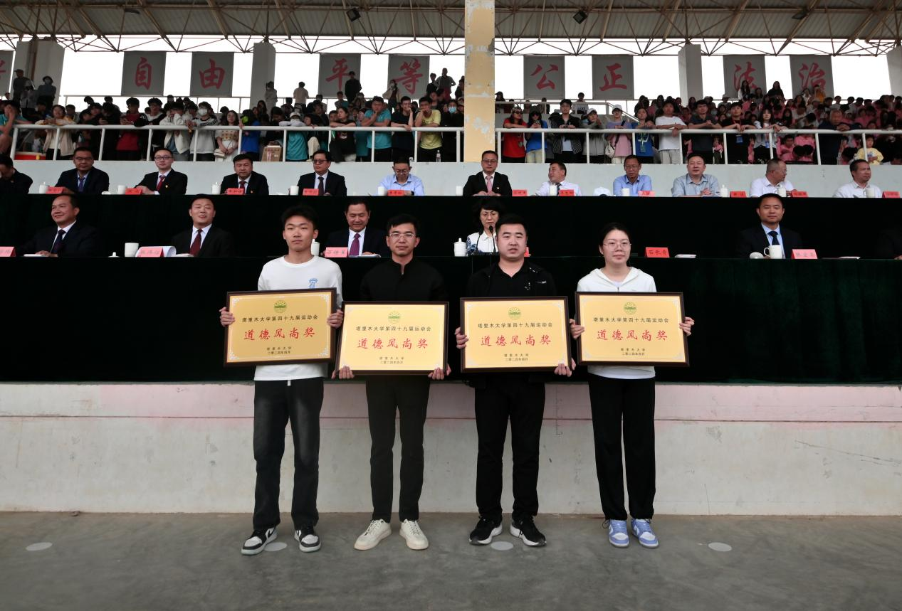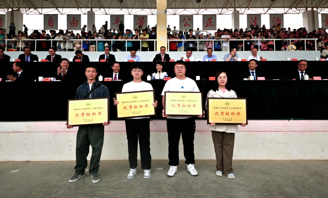 與會領導為“優(yōu)秀裁判員”代表、“優(yōu)秀運動員”代表、“優(yōu)秀志愿者”代表、“優(yōu)秀組織獎”獲獎單位、“體育道德風尚獎”獲獎單位、團體總分前六名單位進行了頒獎。水利與建筑工程學院、經濟與管理學院、機械電氣化工程學院、園藝與林學學院、農學院、人文學院分別獲得團體總分第一名、第二名、第三名、第四名、第五名、第六名。