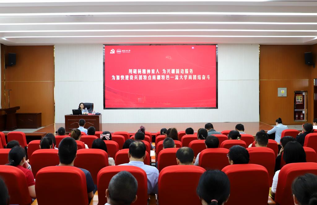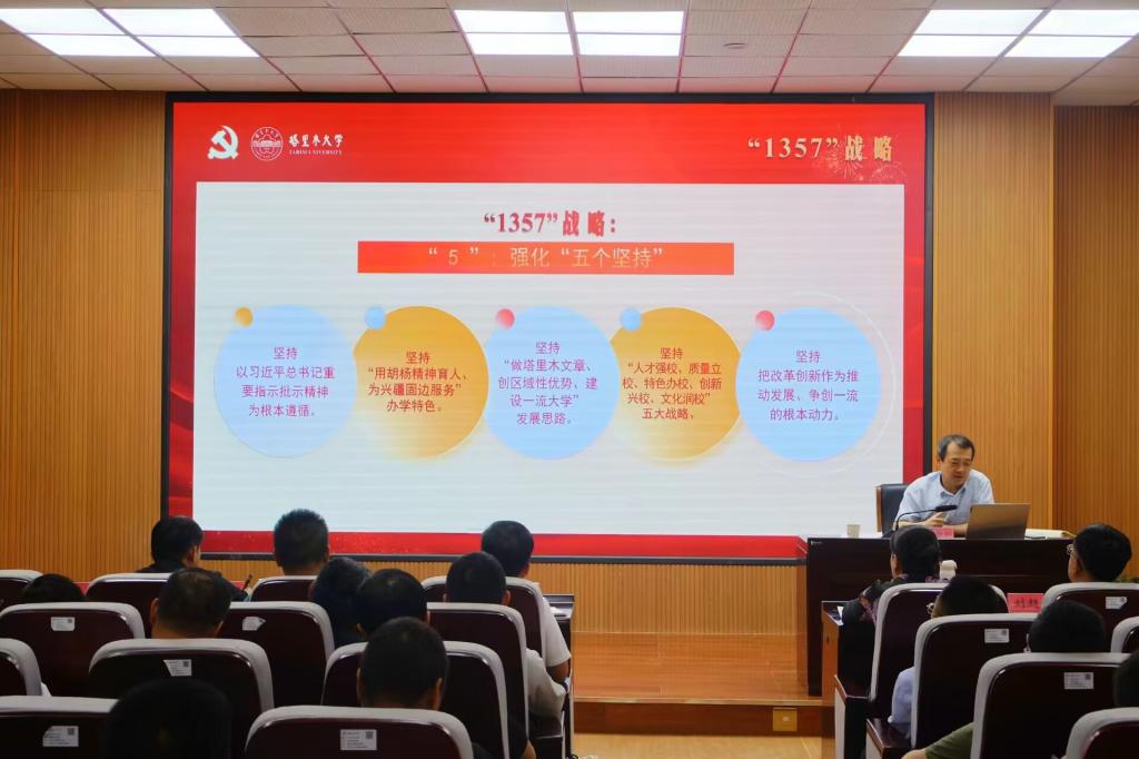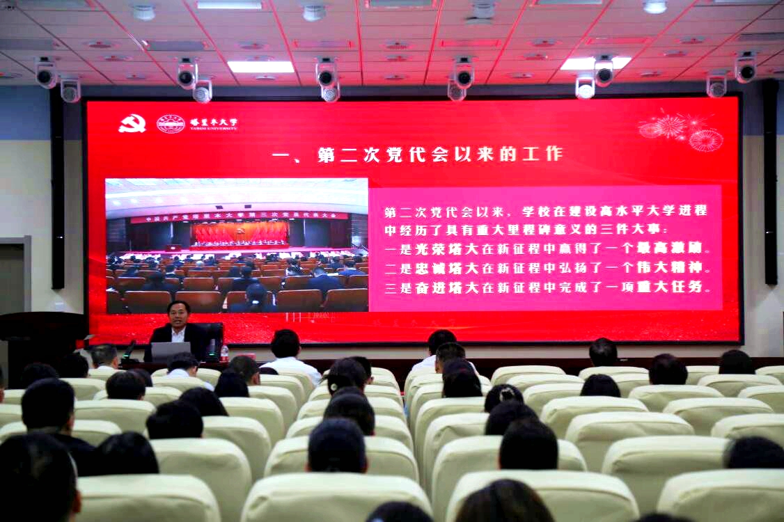 5月8日下午,黨委書記張愛萍,黨委副書記、校長閆祥林,黨委常委、副校長林松濤、湯智輝、居來提·司馬義,黨委常委、紀委書記鄭麟,黨委常委、副校長萬傳星、張宏榮、謝建新,分別赴各學院宣講第三次黨代會、黨委三屆二次全會、“雙代會”精神,作了題為《用胡楊精神育人 為興疆固邊服務 為加快建設兵團特點南疆特色一流大學而團結奮斗》的宣講報告。
