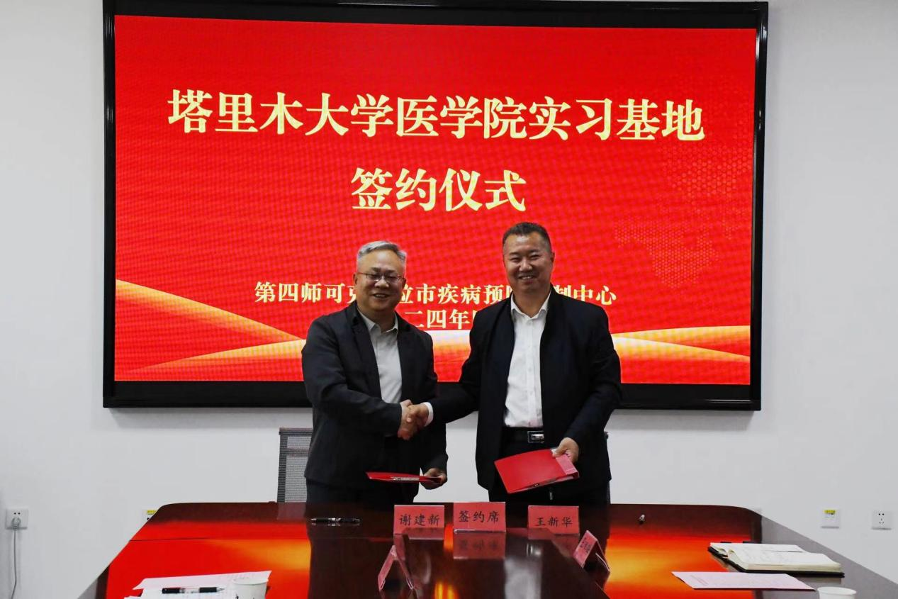 謝建新分別與第四師疾病預防控制中心、阿克蘇地區疾病預防控制中心簽署合作協議書,并為實習基地揭牌。