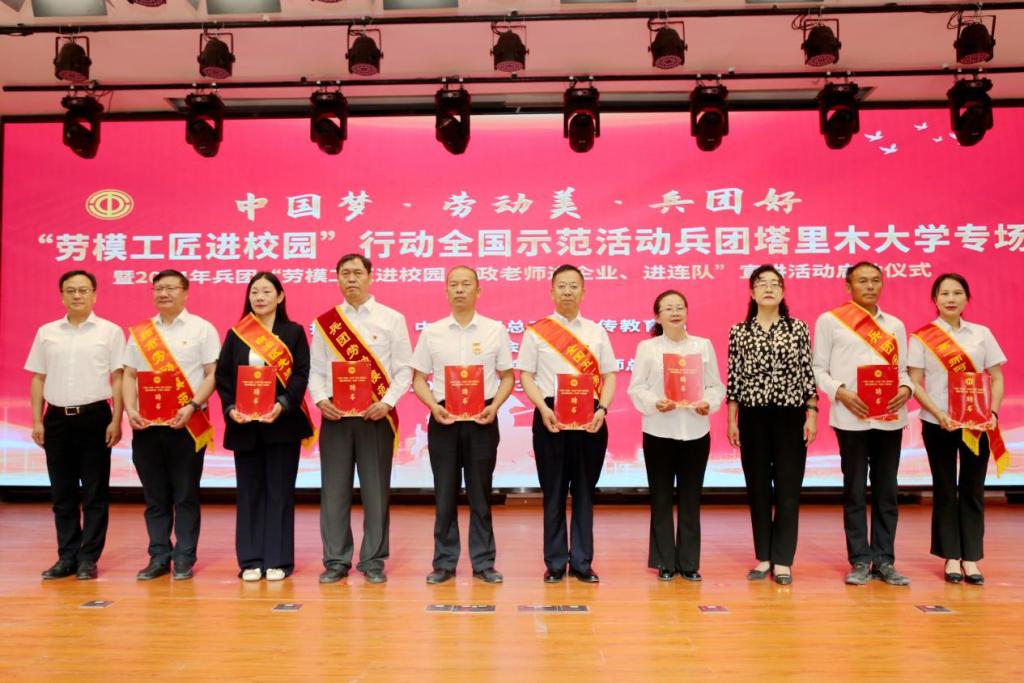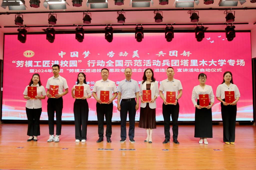 啟動儀式上發布播放了“勞模工匠進校園 思政老師進企業、進連隊”宣講活動計劃視頻和宣講活動師資庫視頻。兵團總工會黨組成員、副主席黃少峰,第一師阿拉爾市黨委常委、第一師副政委,宣傳部部長,阿拉爾市副市長馬榮華,塔里木大學黨委常委、副校長林松濤,為勞模工匠、思政教師頒發了聘書。