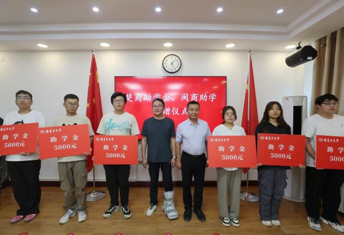 捐贈儀式上,張雄、黃阿德,為受助學生頒發了助學金。此次共有40名學生獲得助學金35萬元,其中,“楚商助學金”將連續四年資助10名學生,每人每年資助5000元;“閩商助學金”一次性資助30名學生,每人資助5000元。