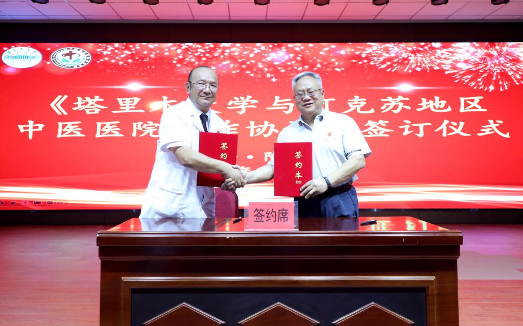 謝建新、阿布來提·阿布都力,代表雙方簽訂了《塔里木大學與阿克蘇地區中醫醫院戰略合作協議》。