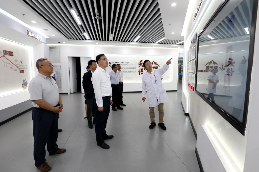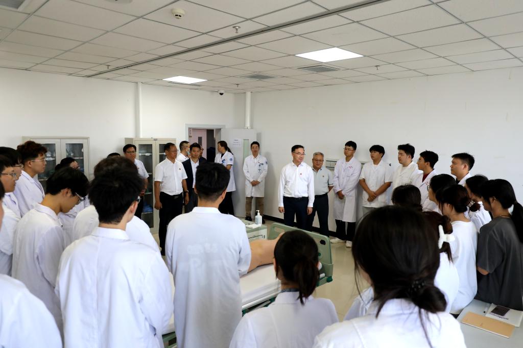 期間,閆祥林一行深入院史文化長廊、婦幼樓17樓教室、臨床技能中心、學生宿舍、食堂、國家區域醫療中心等處,詳細了解醫院師資力量、臨床教學、生活保障等情況,并看望了我校醫學院學生。