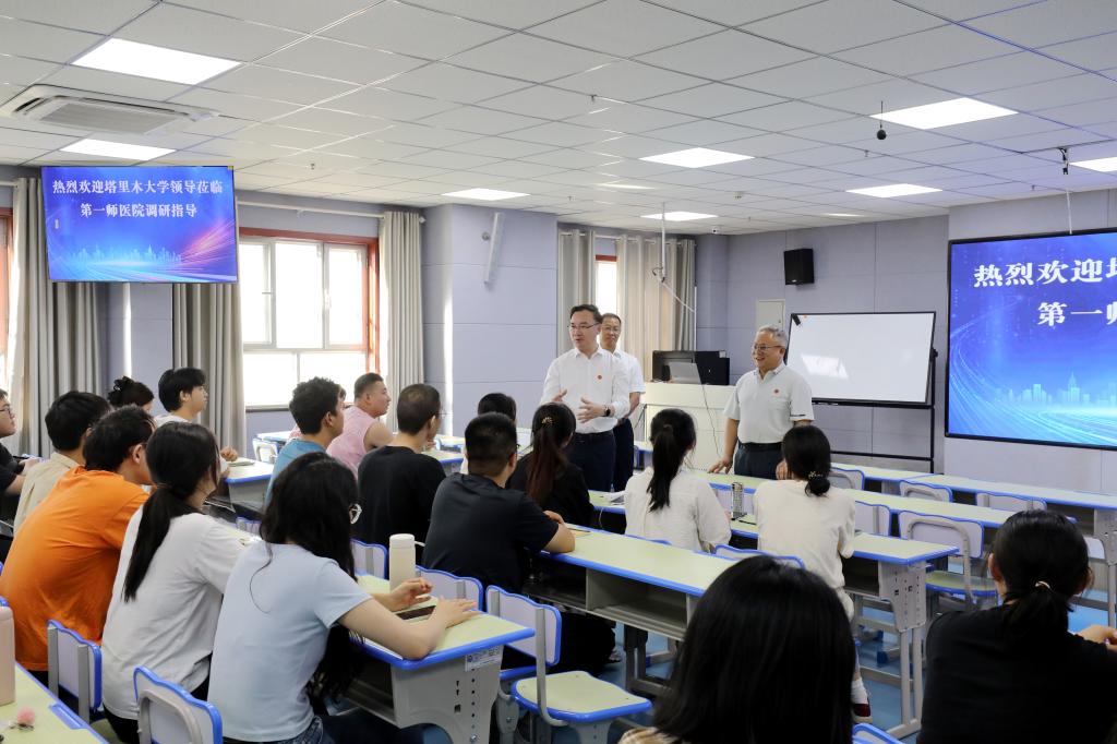 期間,閆祥林一行深入援友之家(援疆館)、院史館、職工食堂、燈光球場、學生宿舍、授課教室等,詳細了解醫院師資力量、臨床教學、生活保障等情況,并看望了我校2021級醫學生,鼓勵同學們要努力學習、勤奮用功、懂得感恩,將來成為一名合格的醫務工作者。