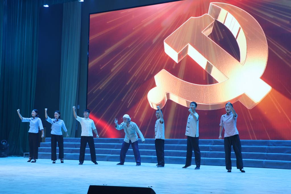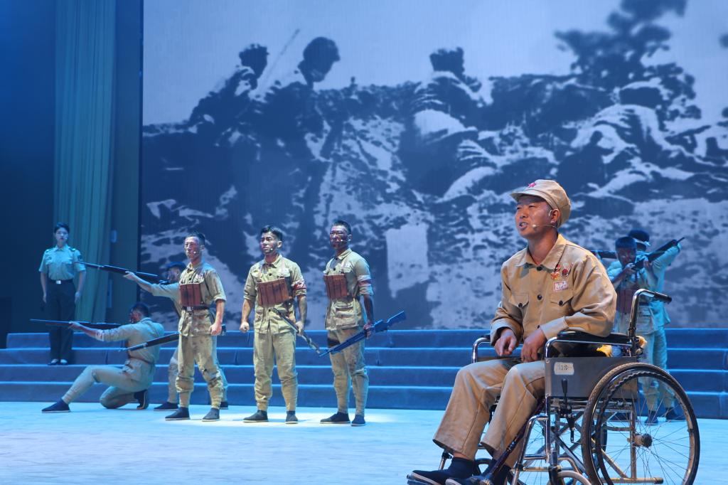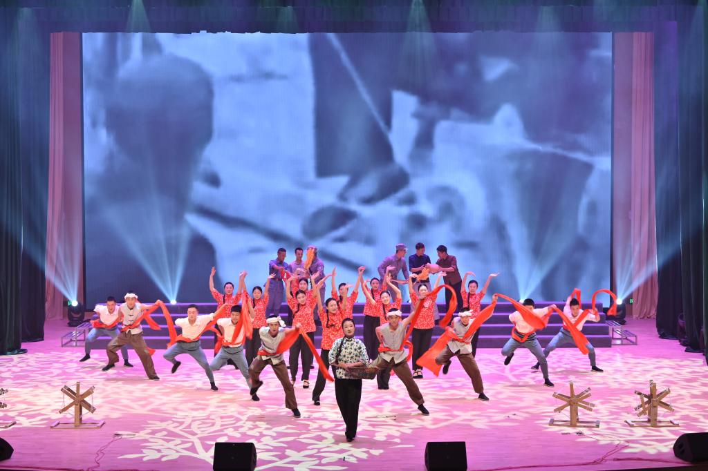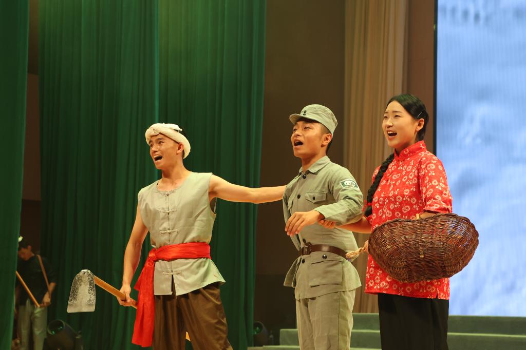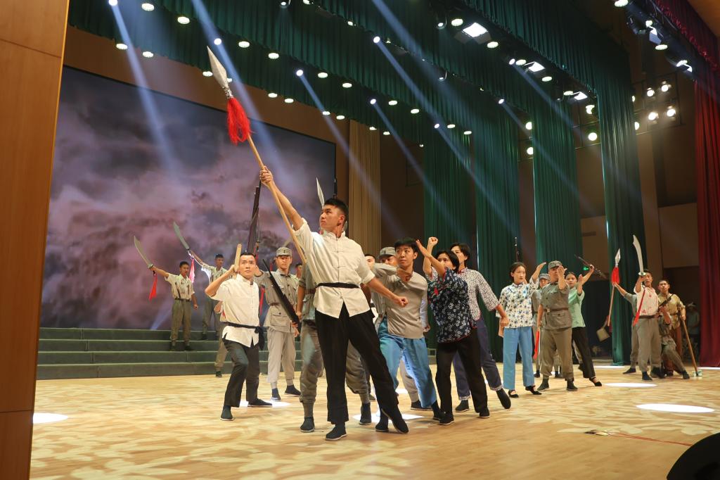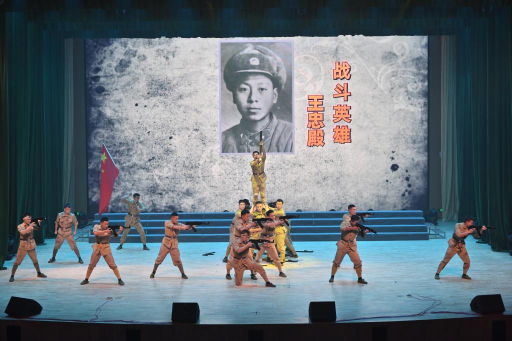 情景表演與小合唱《保衛黃河》、男聲獨唱與合唱《大刀進行曲》、領唱合唱與情景表演《亮劍》,歌聲高亢嘹亮、蕩氣回腸,將觀眾帶入了那個戰火紛飛的年代,共同感受革命戰士的英雄氣概。