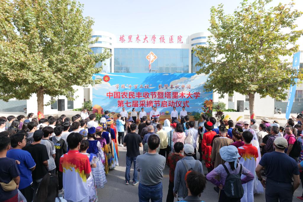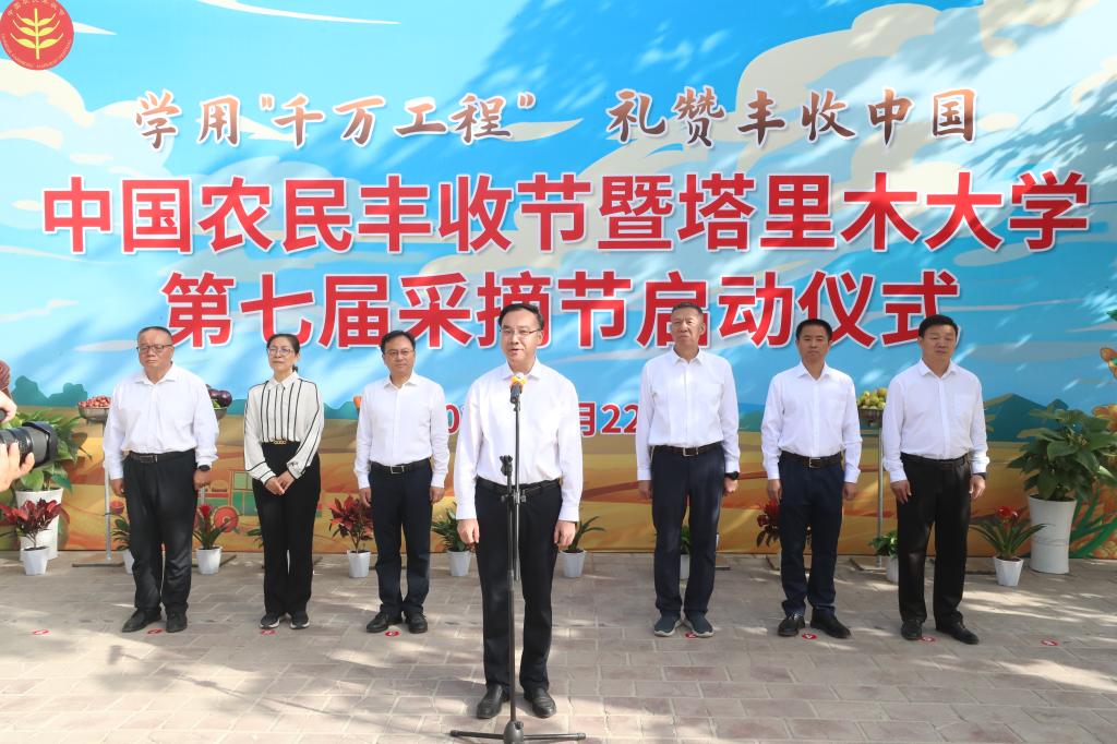 在校醫(yī)院前,閆祥林宣布中國農(nóng)民豐收節(jié)暨塔里木大學第七屆采摘節(jié)開幕,回顧了學校堅持南疆大地辦大學、為南疆鄉(xiāng)村振興和經(jīng)濟社會發(fā)展作出的突出貢獻。鼓勵全體師生強化職責使命、貢獻青春力量;培育節(jié)儉風尚、厲行勤儉節(jié)約;厚植家國情懷、融入工作大局。