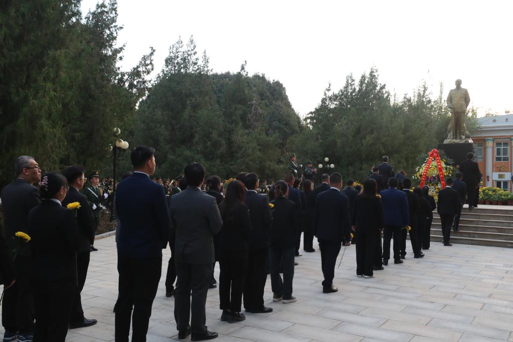 校領導、干部、師生們依次緩步登上銅像基座獻花,向王震將軍銅像鞠躬,緩步繞行,瞻仰王震將軍銅像,追思革命先烈的豐功偉績,表達對革命先烈的無限哀思。