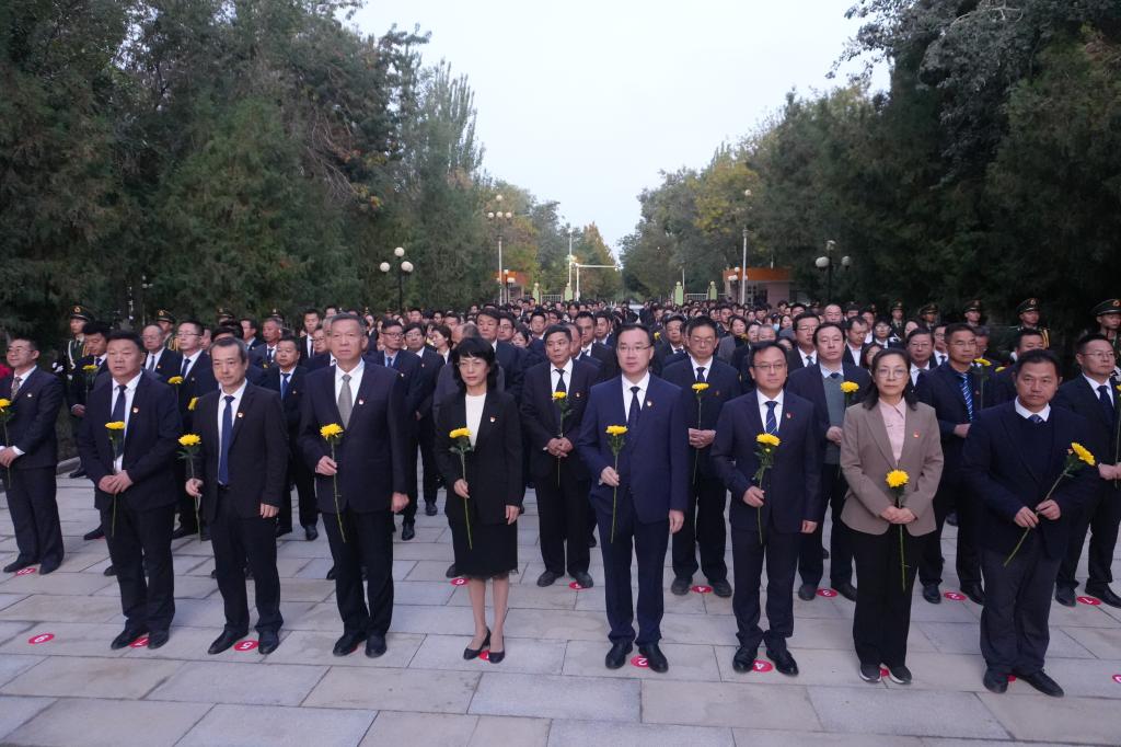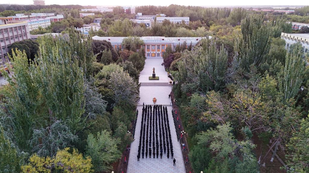 歲月無聲,豐碑為證。秋日晨曦的映襯下,紅色文化廣場兩側松柏蒼翠挺拔,王震將軍銅像巍然聳立。銅像基座上黃菊層層擺放,寄托著全校黨員干部和師生員工對王震將軍的深切緬懷與敬仰之情。
