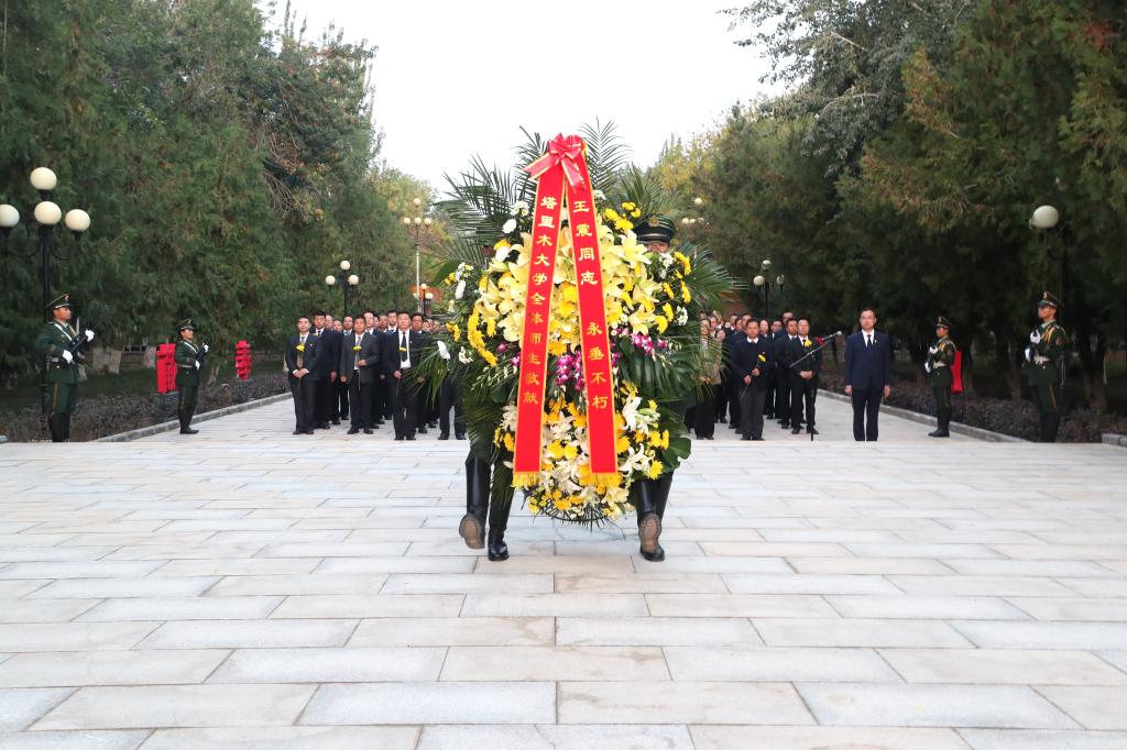 伴隨著《烈士紀念日號角》的奏響,塔里木大學向王震將軍銅像敬獻花籃儀式正式開始。