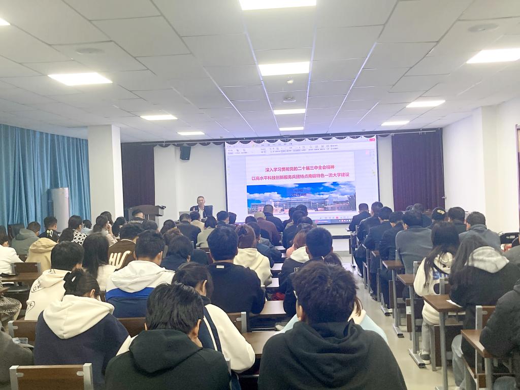 黨委常委、副校長湯智輝為機械電氣化工程學院、紡織服裝學院宣講黨的二十屆三中全會精神。機械電氣化工程學院黨委書記王旭峰主持。