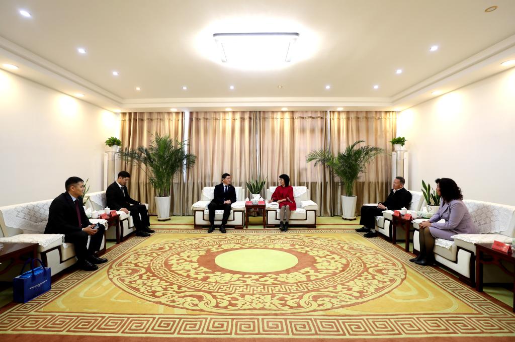 11月22日上午,哈薩克斯坦沙卡里姆大學董事會主席、校長杜曼·奧倫別科夫一行來校訪問,與我校黨委書記張愛萍,黨委副書記于軍等領導,在行政樓四號洽談室進行交流。