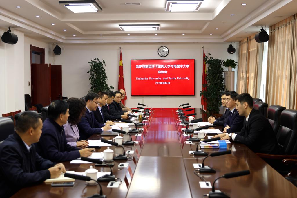 杜曼·奧倫別科夫介紹了沙卡里姆大學發展情況,希望塔里木大學進一步支持和幫助沙卡里姆大學建設發展,在人才培養、科學研究、項目申報等方面加強交流合作,共同服務好經濟社會發展。