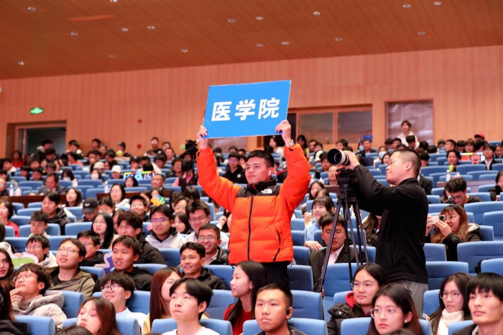 夜幕低垂,華燈初上。報(bào)告廳內(nèi)燈火輝煌,座無虛席,同學(xué)們奮力揮起學(xué)院牌,向參賽選手助威,臉上洋溢著青春的光彩,眼神中閃爍著對詩詞的熱愛和對比賽的期待,無不彰顯著青春的肆意飛揚(yáng)。