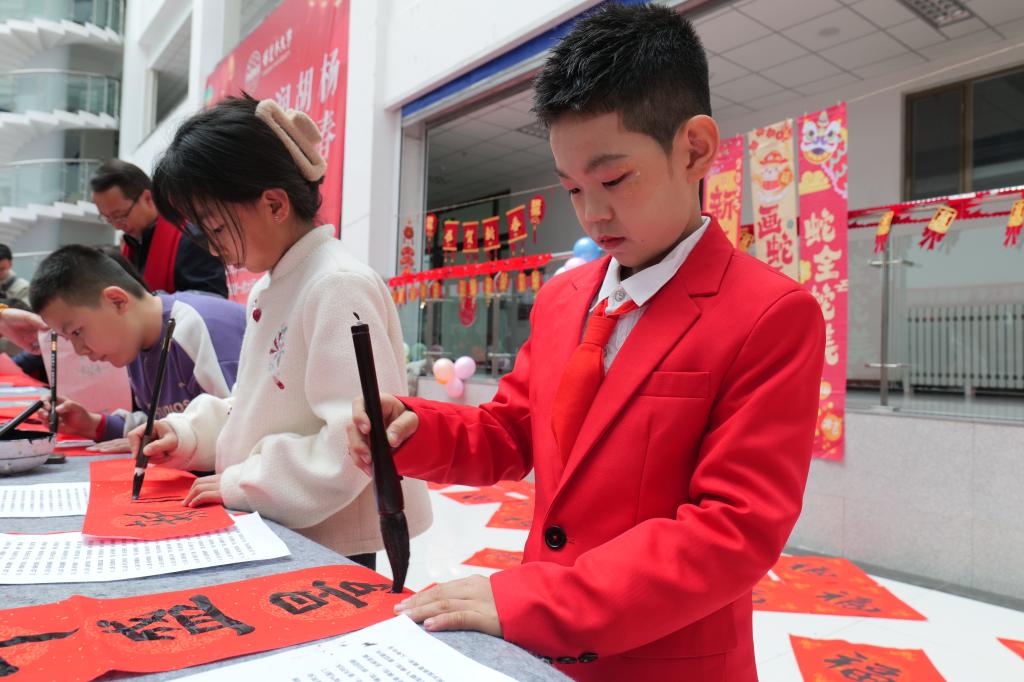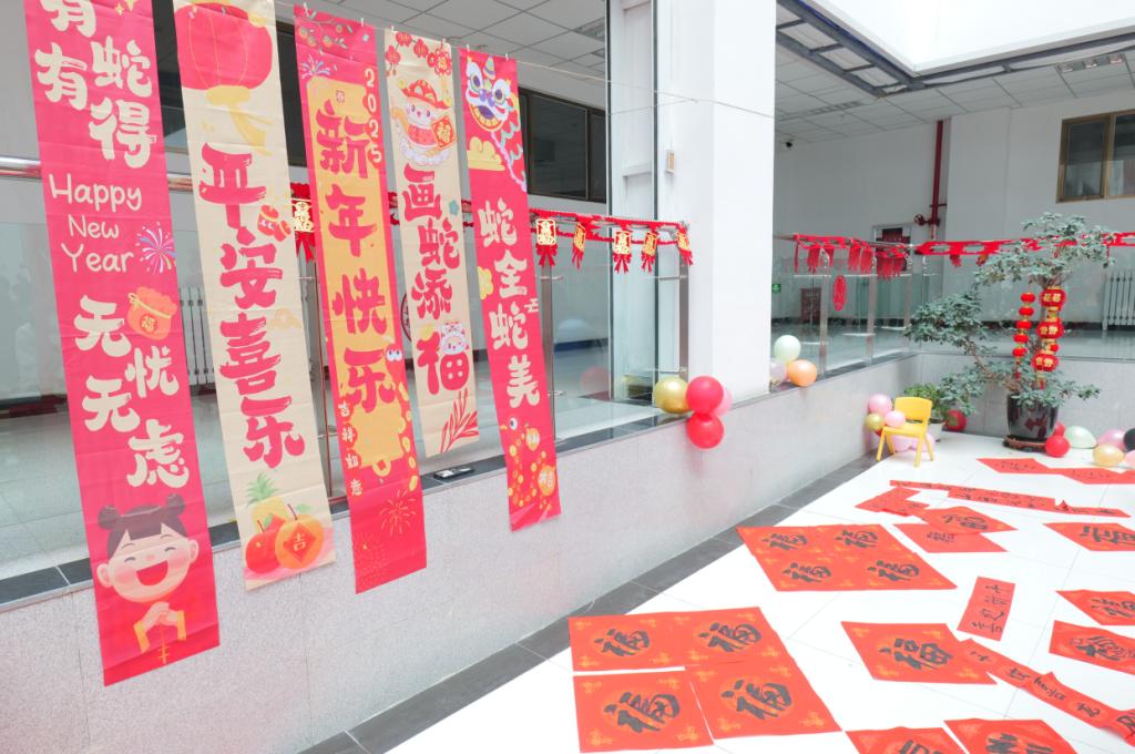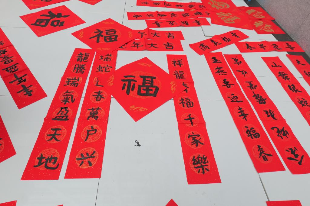 “蛇舞九天辭舊歲,龍騰四海賀新春”……寫對聯、寫福字區域,翰墨飄香,古韻悠然。10位書法愛好者揮毫潑墨,筆走龍蛇,一副副寓意吉祥的對聯、一個個飽滿圓潤的“福”字躍然紙上。對聯融合了傳統詩詞的韻律之美與對新年的美好祈愿,既展現了書法藝術的精湛技藝,又蘊含著深厚的文化內涵。師生們圍在桌邊,或駐足欣賞,或排隊等待領取心儀的墨寶,短短2個小時內,共送出對聯200余副、福字300多個。